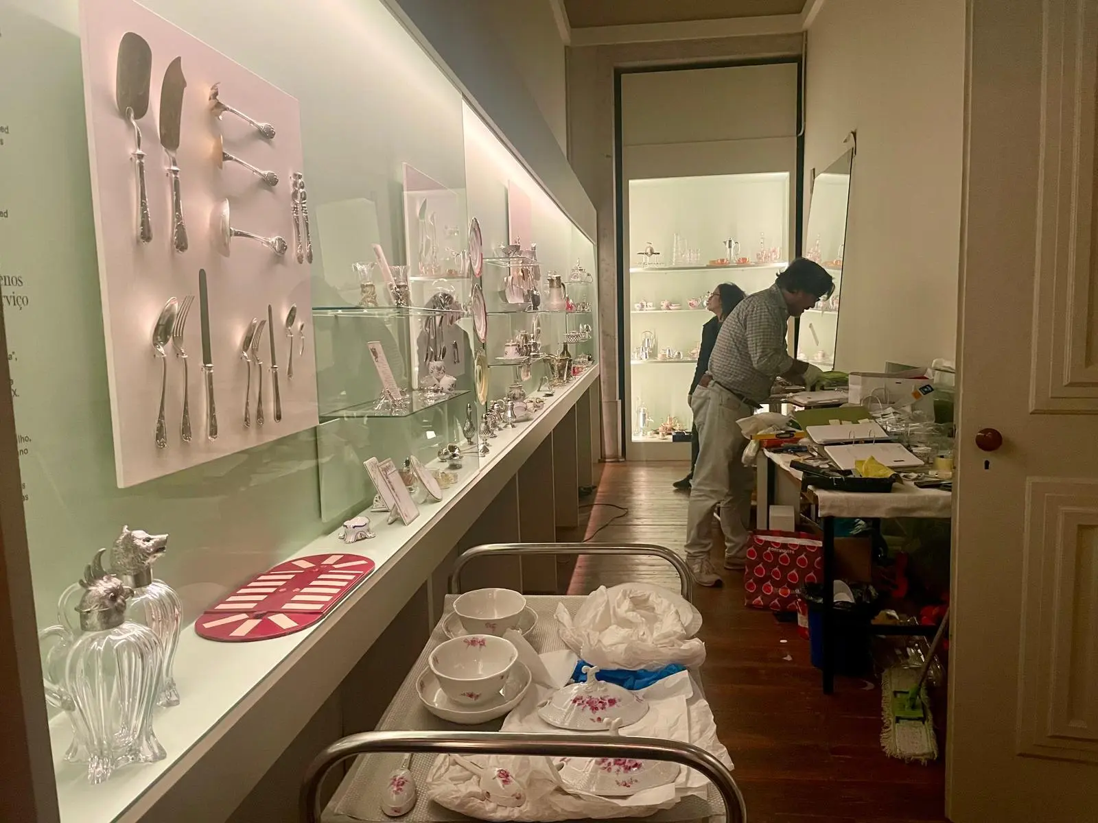 Luxo, luxo está num pequeno espaço onde rivalizam as pequenas peças: serviços de chá, café, chocolate; mini-chávenas e colheres minúsculas; uma pinça para comer espargos, peças de quase joalharia como a molheira que o arquiteto Ricardo Estêvão Pereira toca depois de calçar uma luva branca de algodão.