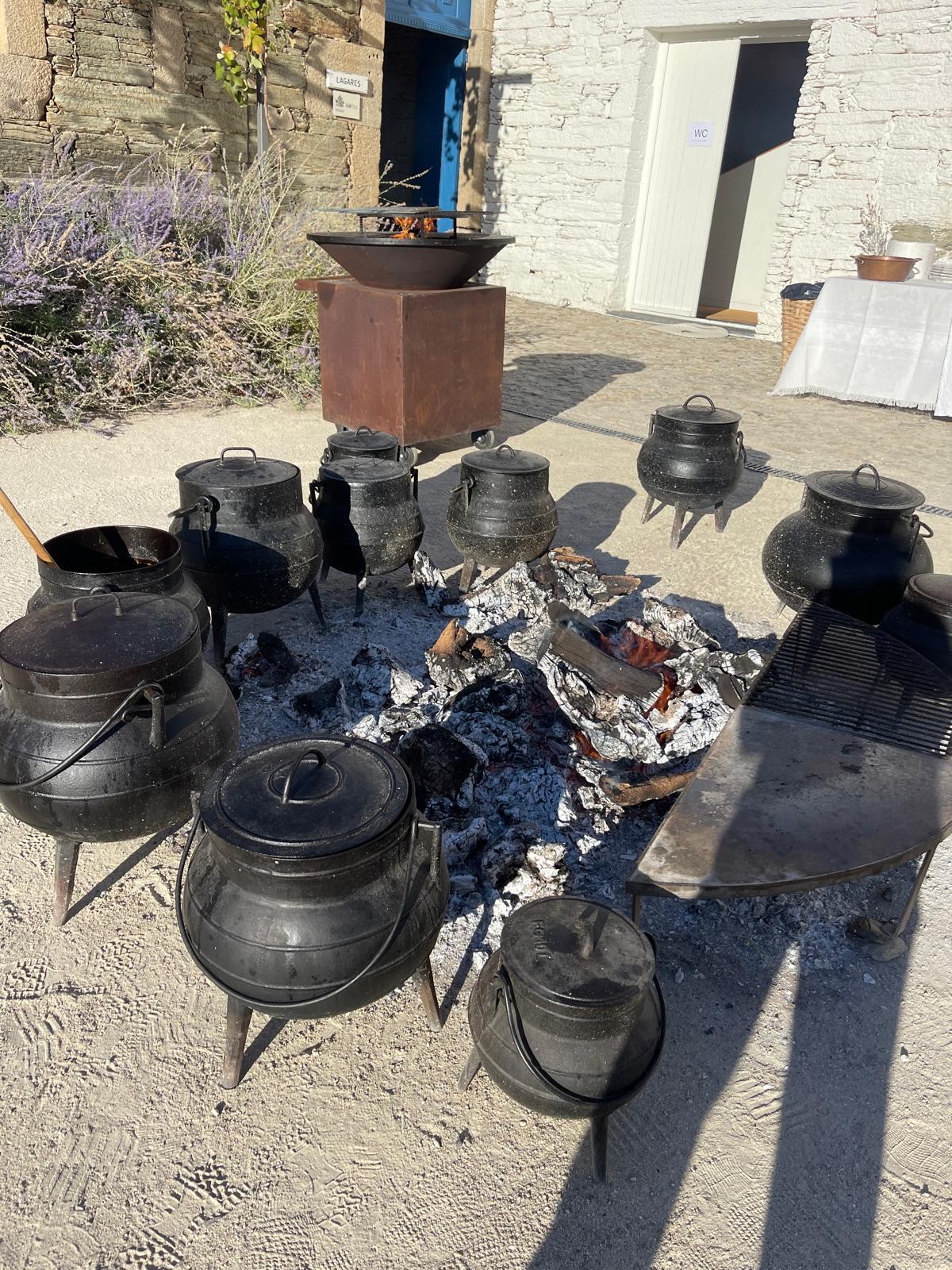 Cinco potes em ferro fundido, cada um com larga folha de serviços e uma história associada, dispostos em círculo sobre as brasas, assumiam-se como figuras centrais de um cenário de arrebatadora beleza.