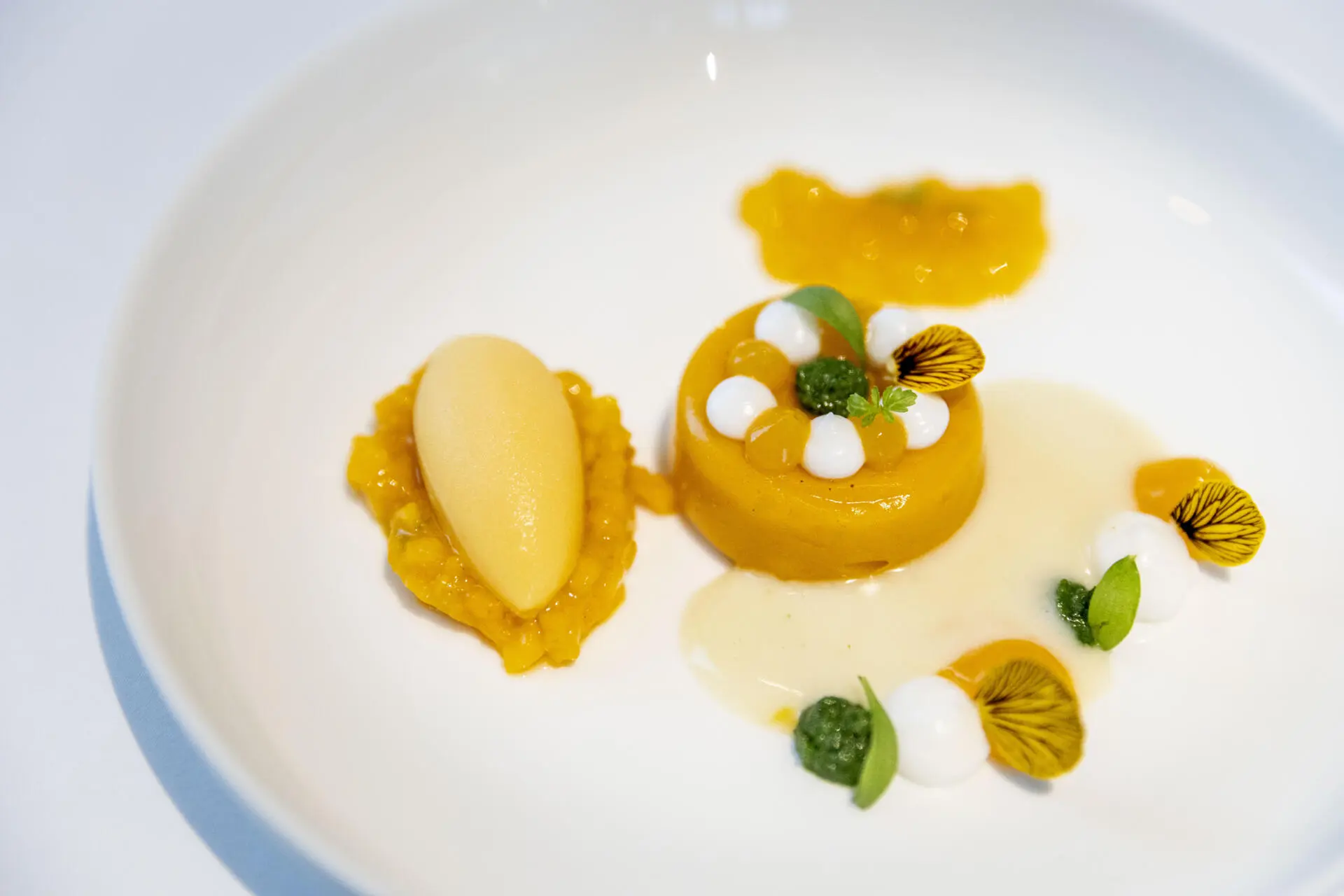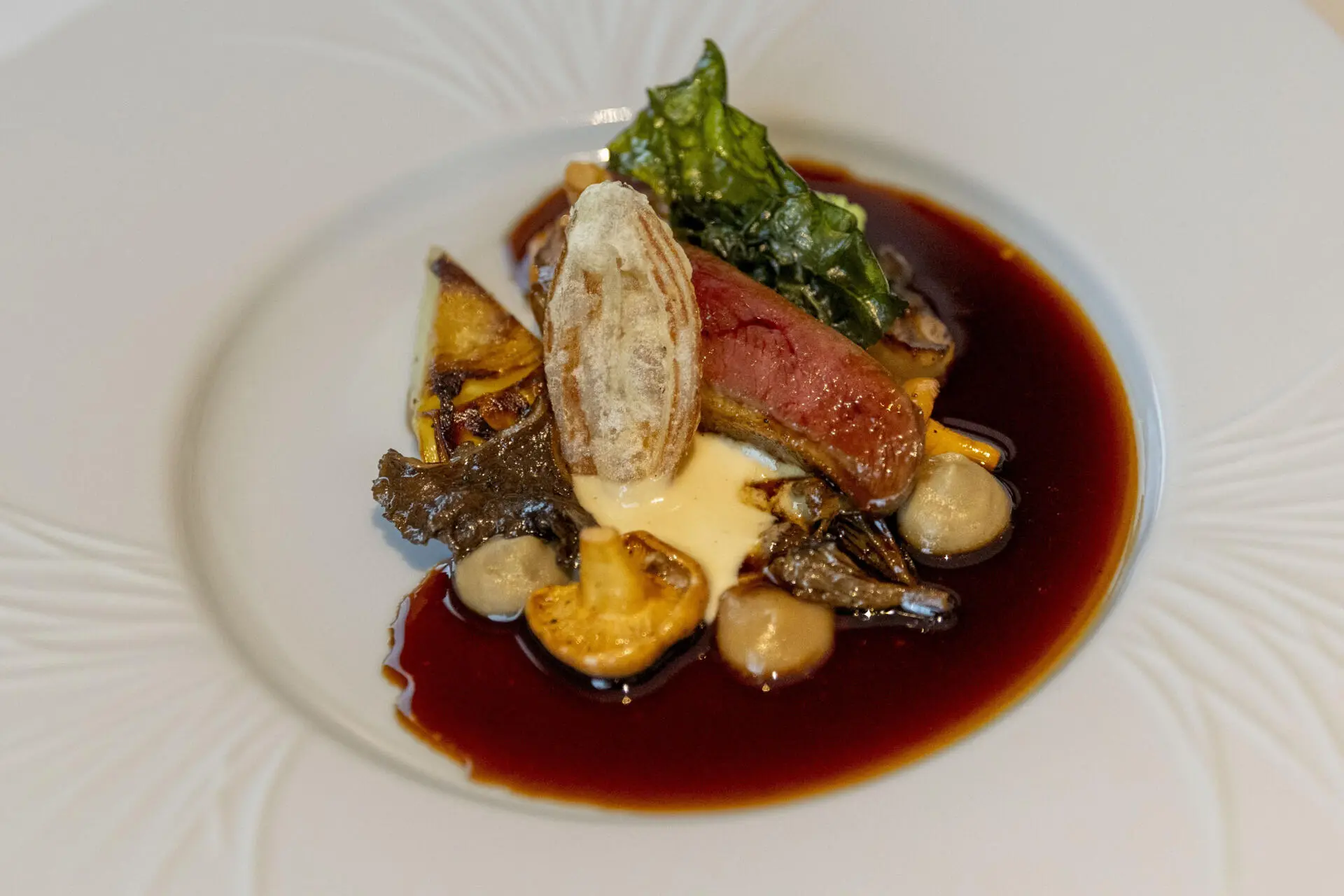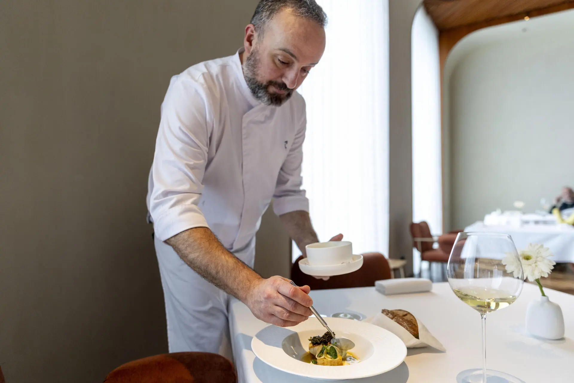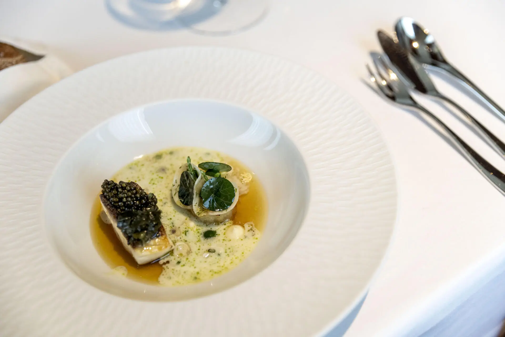 A refeição começa com alguns apontamentos de disparo de sabor e logo vem o primeiro prato. Trata-se de enguia fumada, num tratamento delicado e inteiramente novo do pequeno peixe. Neste caso, a assessoria acontece de forma quase mágica através de rabanetes e maçã, harmonizados com mestria. Segue-se o prato Bivalves, genialmente apresentado como um divertimento de vários exemplares, sobre espargos brancos e manteiga clarificada. Resulta numa incrível ligeireza no palato, ao mesmo tempo que nos mostra detalhadamente cada ingrediente, com cozedura individualizada, para no conjunto tudo funcionar coletivamente na perfeição.