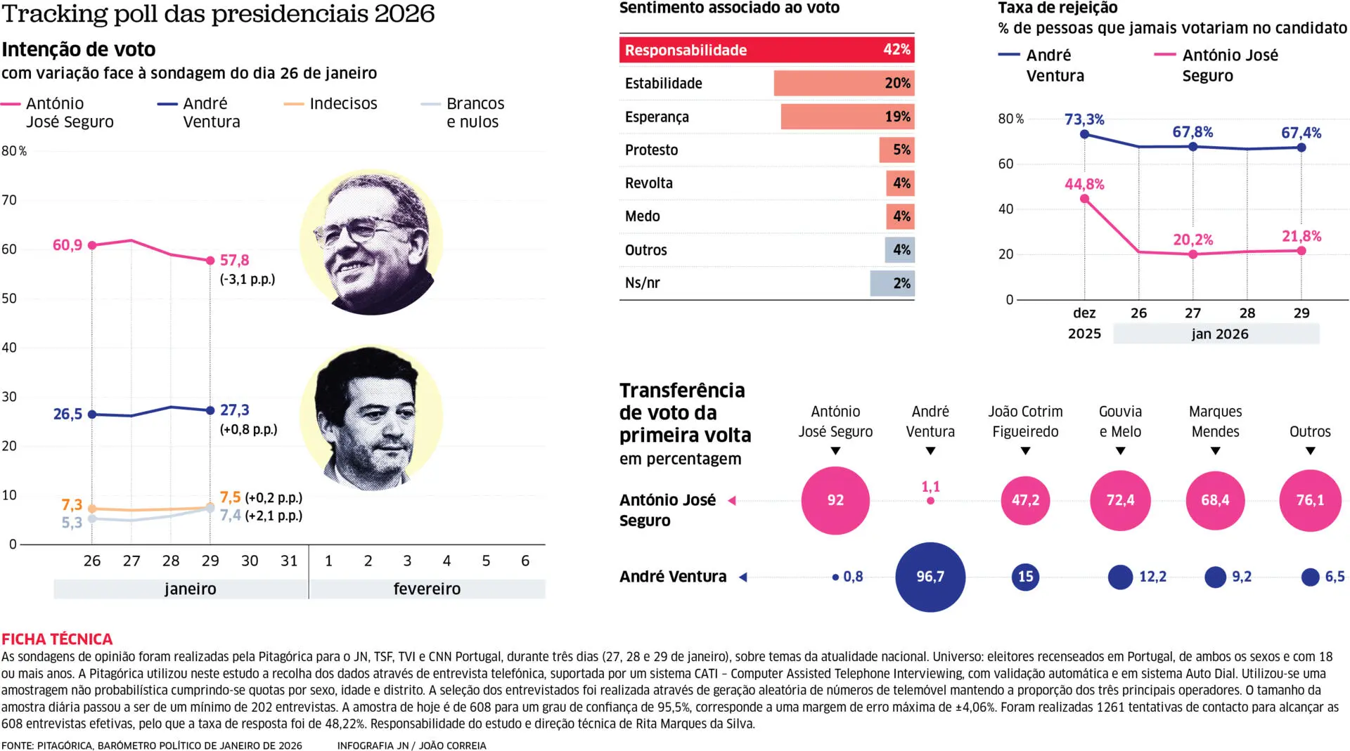 De 27 a 29 de janeiro foi recolhida diariamente pela Pitagórica para a TSF, JN e TVI CNN Portugal, uma subamostra de um mínimo de 202 entrevistas representativa do universo eleitoral português tendo por base os critérios de género, idade e região. O resultado do apuramento dos 3 últimos dias de trabalho de campo, implica uma amostra 608 indivíduos que para um grau de confiança de 95,5% corresponde a uma margem de erro máxima de ±4,06%.