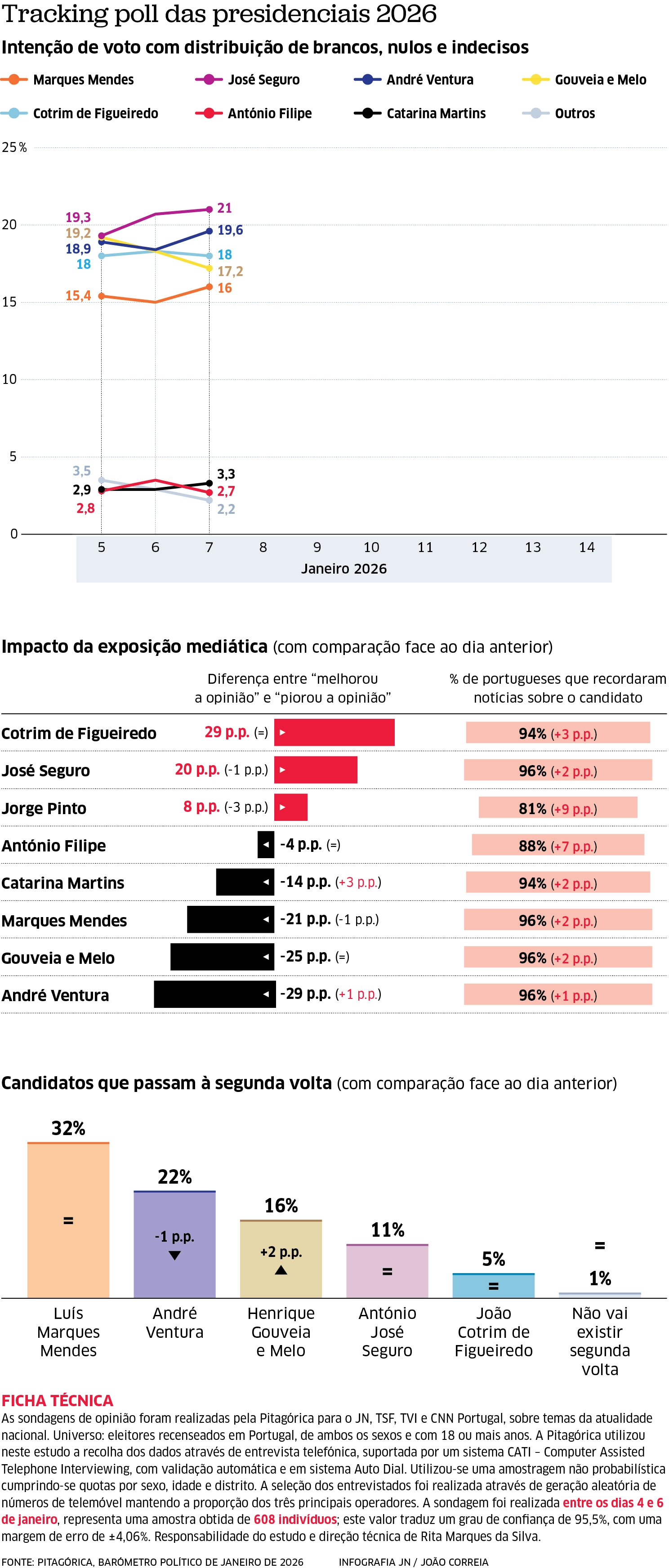 De 4 a 6 de janeiro foi recolhida diariamente pela Pitagórica para a TSF, JN e TVI CNN Portugal, uma subamostra de um mínimo de 202 entrevistas representativa do universo eleitoral português tendo por base os critérios de género, idade e região. O resultado do apuramento dos 3 últimos dias de trabalho de campo, implica uma amostra 608 indivíduos que para um grau de confiança de 95,5% corresponde a uma margem de erro máxima de ±4,06%.