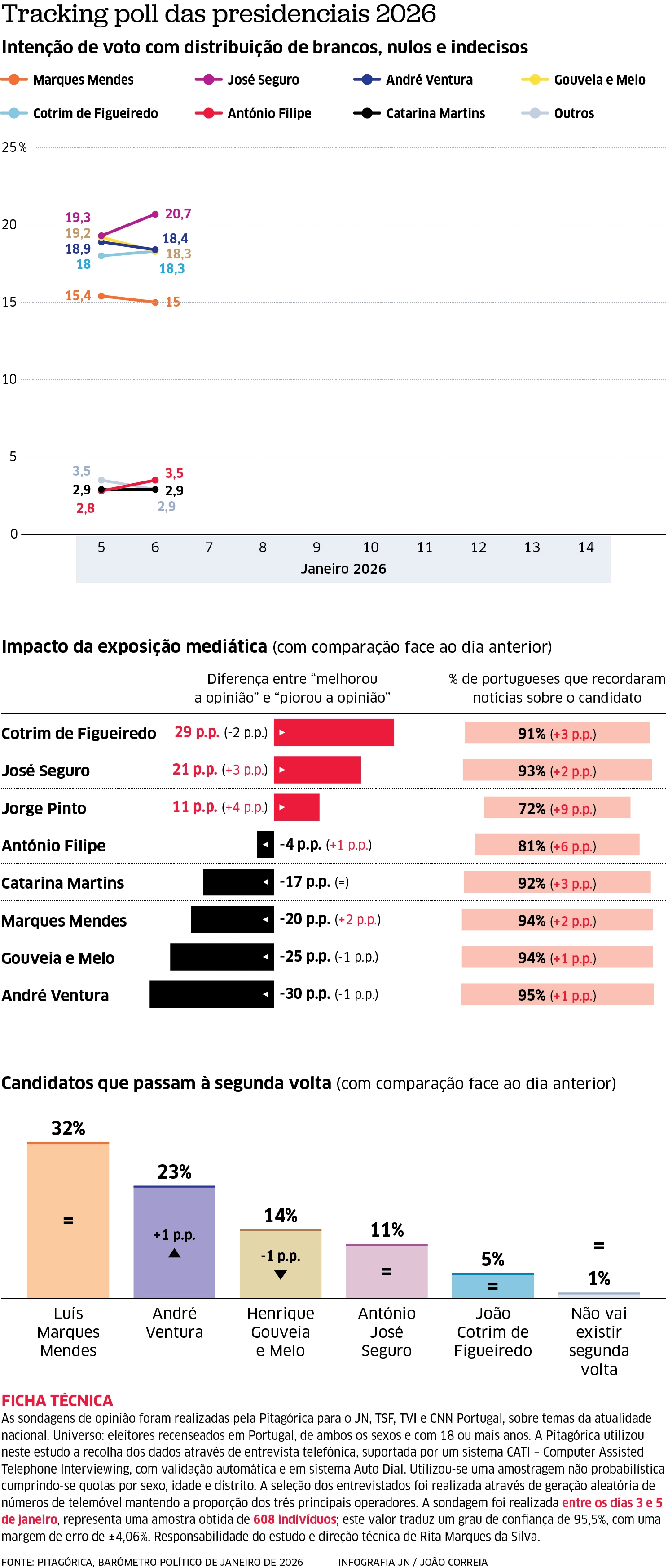 Durante 3 dias (de 3 a 5 de janeiro de 2026) foi recolhida diariamente pela Pitagórica para a TSF, JN e TVI CNN Portugal, uma subamostra de um mínimo de 202 entrevistas representativa do universo eleitoral português (não probabilístico) tendo por base os critérios de género, idade e região. O resultado do apuramento dos 3 últimos dias de trabalho de campo, implica uma amostra 608 indivíduos que para um grau de confiança de 95,5% corresponde a uma margem de erro máxima de ±4,06%. A seleção dos entrevistados foi realizada através de geração aleatória de números de "telemóvel" mantendo a proporção dos 3 principais operadores identificados pelo relatório da ANACOM, sempre que necessário são selecionados aleatoriamente números fixos para apoiar o cumprimento do plano amostral. As entrevistas são recolhidas através de entrevista telefónica (CATI - Computer Assisted Telephone Interviewing). O estudo tem como objetivo avaliar a opinião dos eleitores Portugueses, sobre temas relacionados com as eleições, nomeadamente os principais protagonistas, os momentos da campanha bem como a intenção de voto nos vários partidos. A taxa de resposta foi de 49,84%, a direção técnica do estudo é da responsabilidade de Rita Marques da Silva.