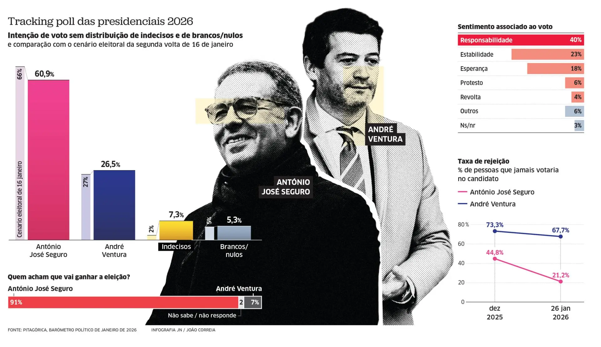 António José Seguro regista 60,9% das intenções de voto, muito acima dos 26,5% de André Ventura, nesta sondagem sem distribuição proporcional de indecisos, porque, como explica a Pitagórica, "com dois candidatos, a distribuição de indecisos deixa de ser neutra: qualquer modelo empurra artificialmente um e penaliza o outro" e "sem histórico de segundas voltas", a opção foi apresentar os resultados diretos.