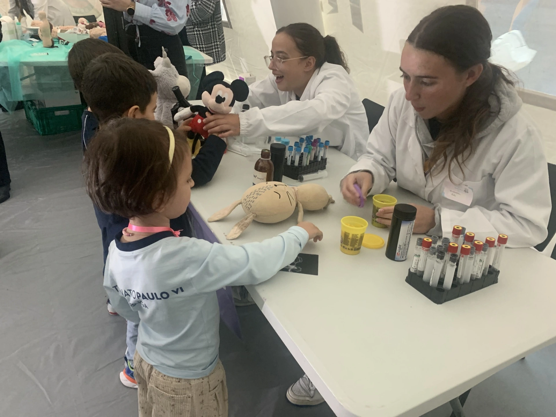 Uma delas simula uma consulta, com vacinas, termómetros e estetoscópios de brincar. Num outro posto, as crianças podem fazer um raio X ao seu peluche. Segue-se a mesa de enfermagem e análises clínicas, onde os mais novos olham para amostras de sangue através de um microscópio ou dão injeções aos bonecos. Do outro lado dessa mesa, há um posto onde se mergulha na nutrição e no poder dos alimentos. Há também uma mesa onde um urso de peluche, deitado, espera para ser operado; um posto dedicado à psicologia, onde se explora as emoções; a mesa da saúde oral com uma grande boca de brincar, cheia de dentes e, por último, o posto da visão, onde, entre os jogos, está a possibilidade de verem dinossauros ou o homem-aranha com óculos 3D.