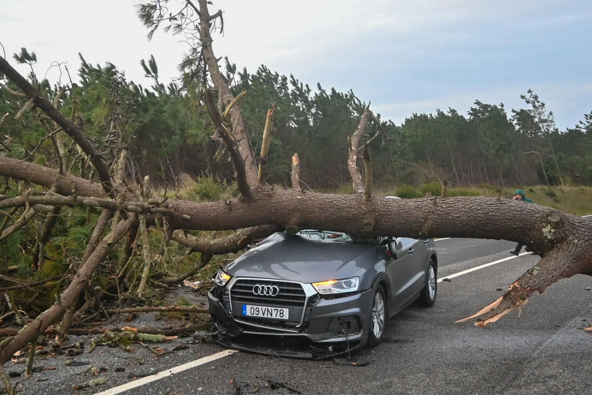 - Uma árvore de grande porte caiu sobre uma viatura que circulava na Estrada Atlântica, que liga Salir do Porto e Foz do Arelho. Créditos: Carlos Barroso/Lusa