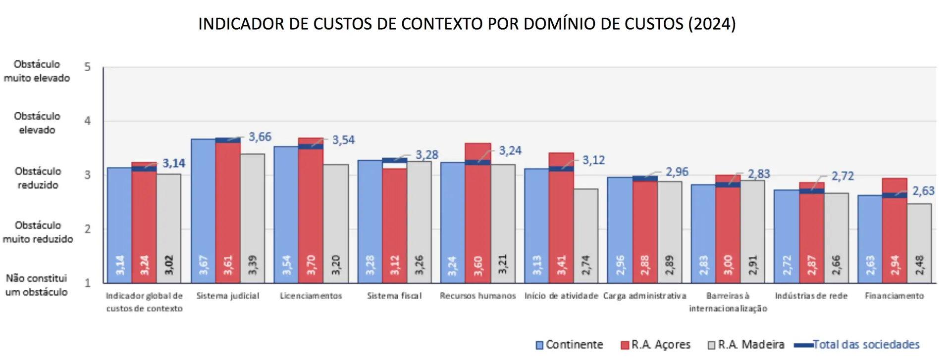 Já o domínio dos licenciamentos recebe 3,54 pontos, o que o torna no segundo custo de contexto mais pesado, na opinião dos empresários. Mas, para as empresas do setor da indústria, neste "domínio dos licenciamentos, a obtenção de licenças e certificações ambientais foi identificada como o principal obstáculo".
